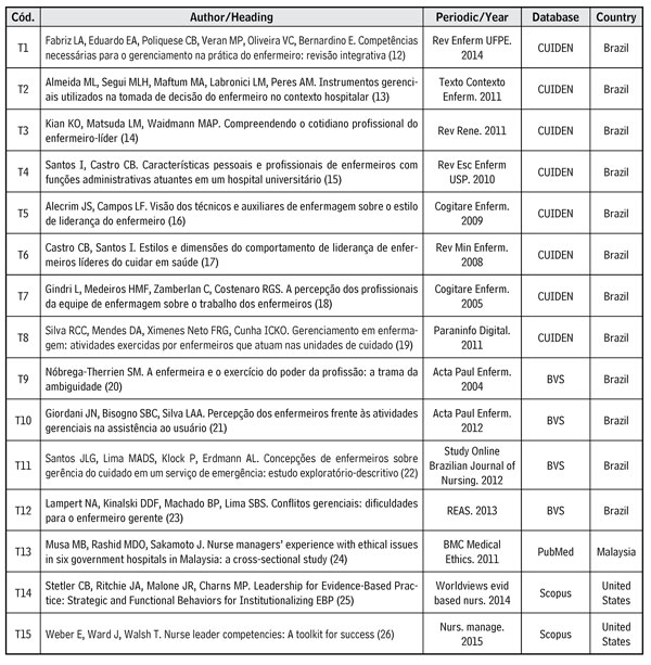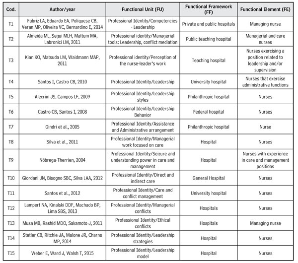 The studies that approach the subject leadership (T1, T2, T3, T4, T5, T6, T7, T14 and T15) bring about this competence, which evidences that the majority of the nurses who are in command and leadership position are female, and that a good part has one or no children at all. Some studies have positive and negative aspects related to leadership deficiencies or its lack.