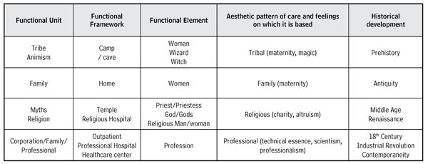The FU dwells on the basic social structure of socialization, where it brings together elements referring to beliefs, values, feelings and knowledge. Each of them focuses on a specific way of organizing and founding nursing: Domestic, religious, technical, professional and humanist”. (10:303)