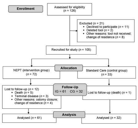 The sample size was obtained during 2015 and 2016, in nine hospital units in northern Portugal. For the intervention group (IG) subjects from four hospitals with Stomatherapy Nursing Consultation (SNC) were selected and the participants allocated to the control group (CG) were from five hospitals without SNC or ETN. The criteria for inclusion in the sample include individuals hospitalized for ostomy elective surgery or even ostomy palliative surgery; with primary bowel or urinary stoma (temporary or permanent); aged 18 years or older, and study volunteers.