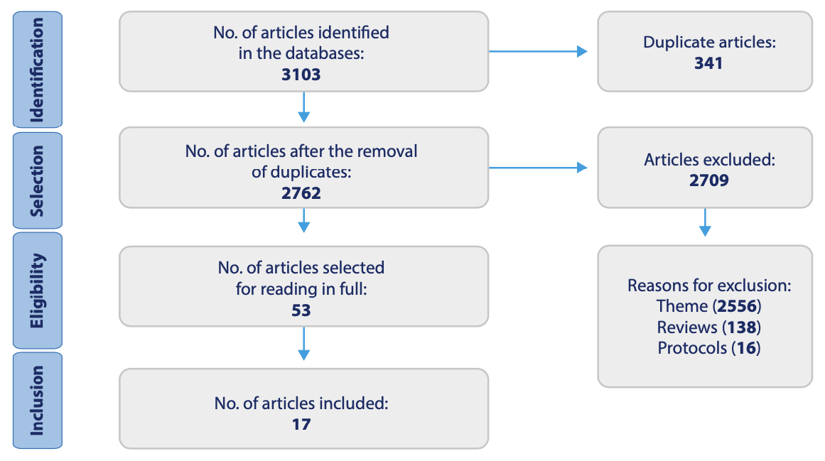 Based on the databases researched and the search strategies and descriptors mentioned above, 3103 articles were found, of which 27 were found on Lilacs (16 in Portuguese, 7 in Spanish, and 4 in English), 391 on Medline (37 in Portuguese, 18 in Spanish, and 337 in English), 2172 on PubMed, and 568 on Scopus. Of the 3103 articles, 341 were duplicates, with 2762 articles remaining for title and abstract reading. After considering the inclusion and exclusion criteria, 53 were selected for reading in full and 17 were included in the review to discuss their findings (Figure 1).
