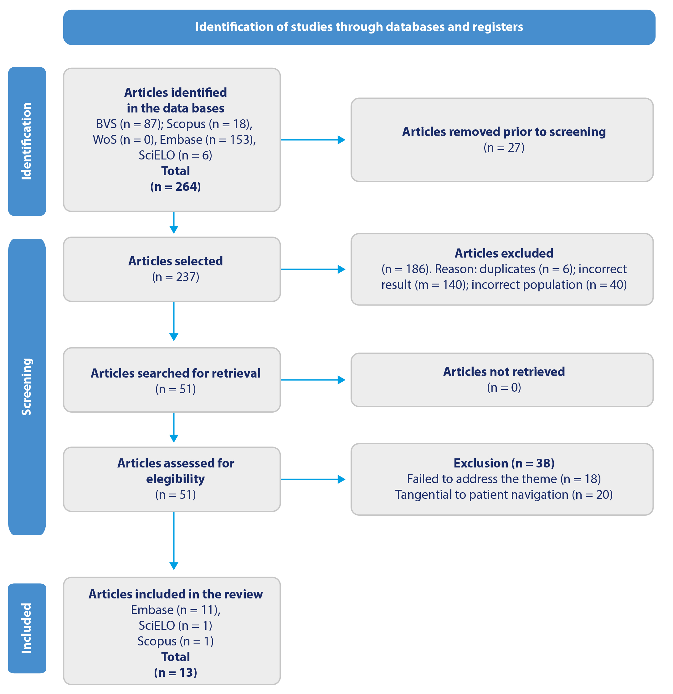 A total of 264 records were identified and, after applying the inclusion filters, reading the titles and abstracts, and reading the full text, 13 articles were included as the corpus for the synthesis, as shown in Figure 1, using the Preferred Reporting Items for Systematic Reviews and Meta-Analyses - Prisma (22) checking flowchart.