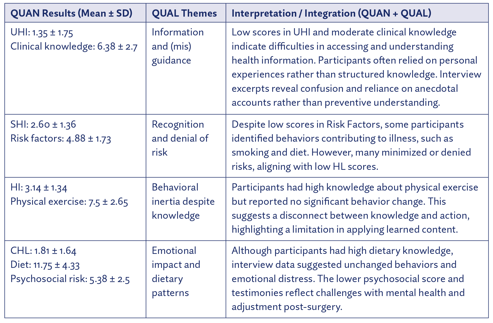 This joint presentation corroborates the dialogic nature of mixed methods research, highlighting how qualitative data can explain or contrast quantitative findings, enriching interpretation and providing insights into the complexity of health literacy and behavior.