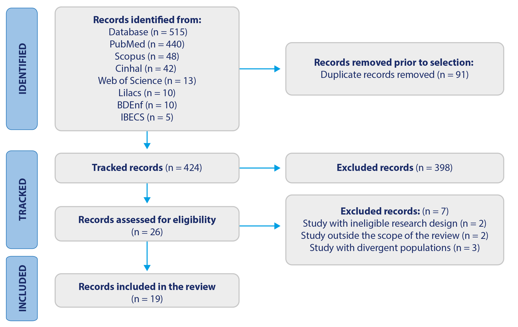 The searches were conducted in March and April 2024 in the following databases: Scopus, Web of Science, PubMed/Medline, Latin American and Caribbean Health Sciences Literature (Lilacs), Cumulative Index to Nursing and Allied Health Literature (Cinahl), BDEnf, and IBECS. In addition, a search for publications was conducted on Google Scholar.