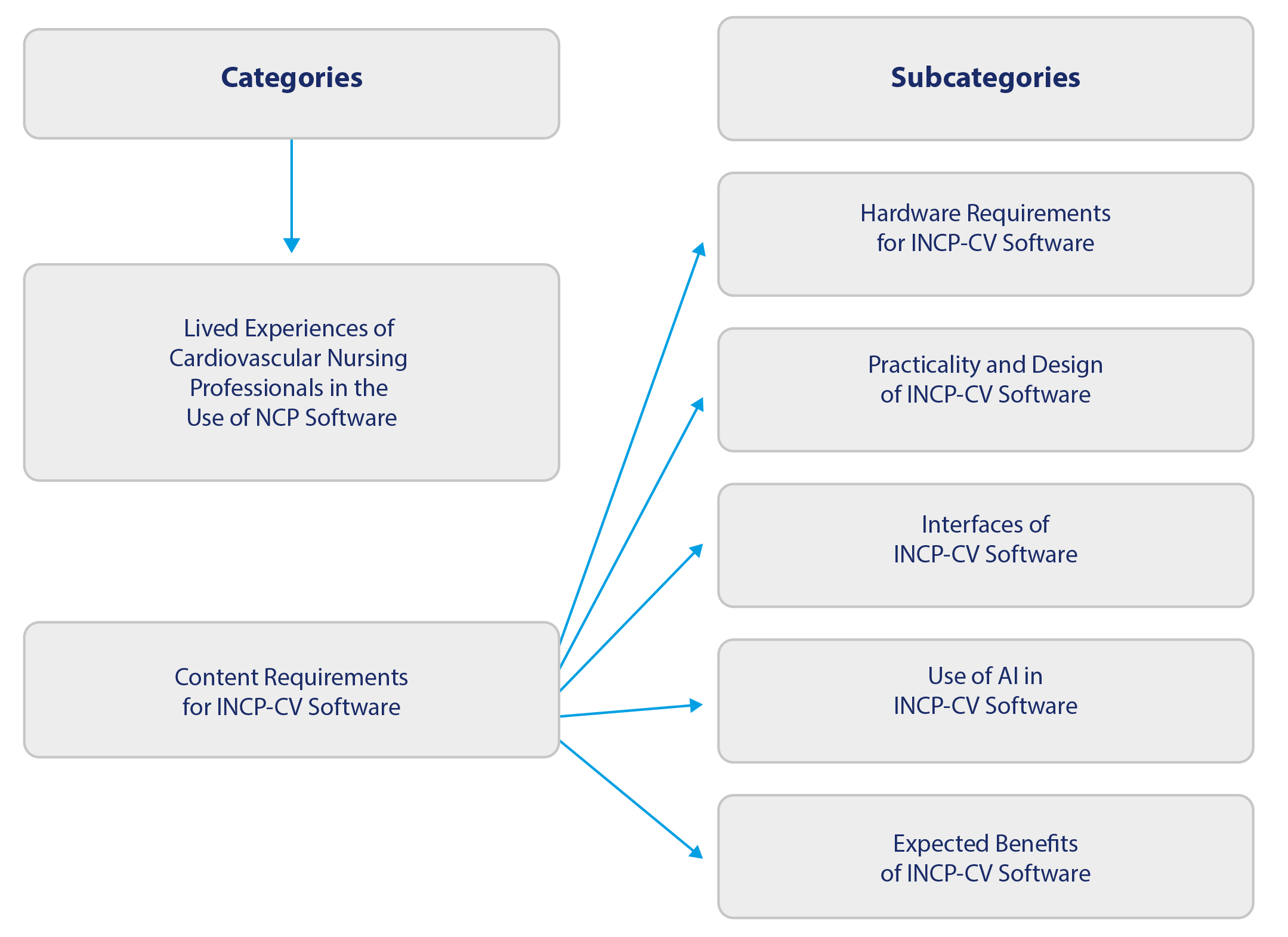 Subsequently, the category titled "Content Requirements for IN-CP-CV Software" was identified, which encompasses all reflections regarding the content requirements that this computing tool must possess to generate INCPs for cardiovascular patients. This category, in turn, includes five subcategories: hardware of the INCP-CV software; practicality and design of the INCP-CV software; interfaces of the INCP-CV software; use of artificial intelligence in the INCP-CV software, and expected benefits of the INCP-CV software.