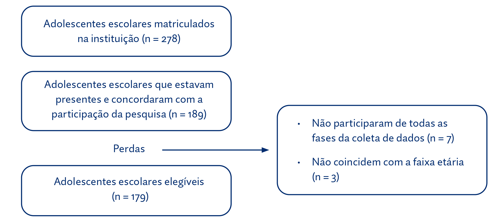 A população do estudo constituiu-se por adolescentes escolares da instituição supracitada, totalizando 278 alunos. Considerou-se como critérios de inclusão ser adolescentes escolares com idade entre 10 e 19 anos, intervalo de idade da adolescência que é preconizado pela Organização Mundial da Saúde 13; matriculados na rede estadual de ensino; residentes do município de Vitória de Santo Antão. Foram excluídos da pesquisa estudantes que estiveram ausentes no dia da intervenção educativa. A amostra foi do tipo não probabilística por conveniência, em que 189 estudantes estavam presentes e concordaram em participar da pesquisa, dos quais sete não participaram de todos os momentos da coleta de dados e três não coincidiram com a faixa etária adotada, finalizando a amostra com 179 participantes elegíveis. Após 40 dias da intervenção, dos 179 adolescentes elegíveis, apenas 139 responderam ao instrumento de pesquisa. A perda amostral é apresentada na Figura 1.