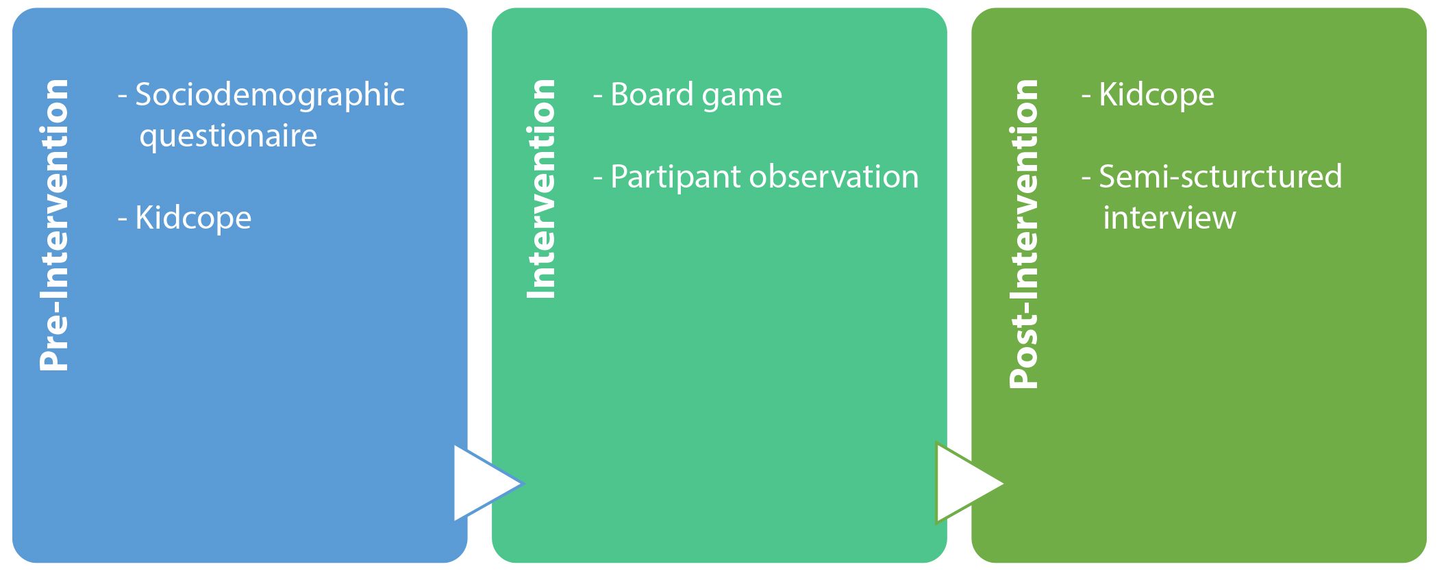 Materiales y métodos: Este método mixto, convergente incluyó 35 niños (8-12 años), con un diagnóstico de cáncer de al menos un mes y que estuvieran en tratamiento de quimioterapia ambulatoria. La intervención utilizó un juego de mesa validado para niños con cáncer. Cuantitativamente, se realizó un estudio cuasiexperimental; la información se recolectó antes y después de la intervención usando el instrumento Kidcope y se analizó a través de estadísticas descriptivas e inferenciales. Cualitativamente, la observación-participante y entrevistas semiestructuradas complementaron la información del Kidcope, que fueron analizadas por medio del análisis de contenidos.