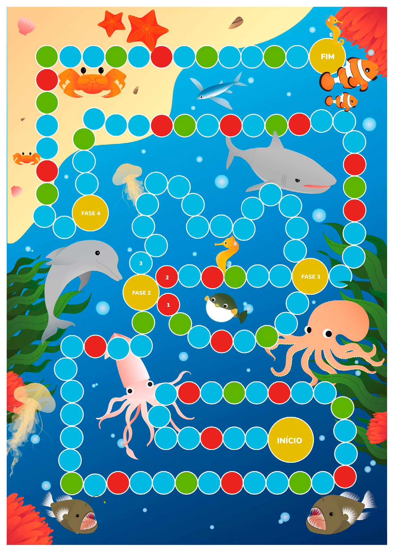 The intervention consisted of applying the board game Skuba! An Adventure under the Sea (Figure 2). First, the game, its rules and objectives were presented and one of the researchers played the game with the child. The game is played under the sea. The main character (the child) is a navigator sailing through a big storm and is taken to the deepest region of the sea, a totally unknown environment. The navigator must be able to return to the surface of the sea, but to be successful, the navigator has to overcome situations that are associated with the experiences and challenges of the child during the disease and treatment process. Immersed in this context, the child has to use strategies to overcome the adversities. The game has luck, bad luck, negotiation, and information cards, some of them with analogies between marine characters and the child's disease/treatment; for example: "Information card - The shark has a sensor that detects the presence of the enemy, just as our body has soldiers that recognize the presence of enemies, like viruses and bacteria. Advance four spaces."