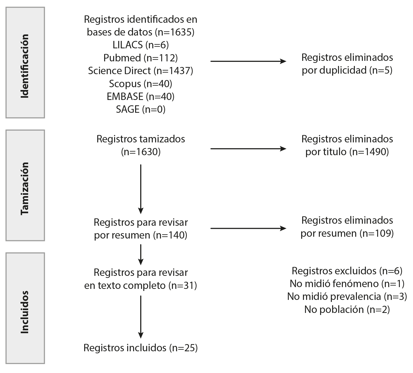Figure 1 shows the flowchart of the results of the searches, screening, selection, and total number of articles included in the review. A total of 1,635 articles were identified in all databases. After removing duplicates and those in languages other than Spanish, English, and Portuguese, and screening by title and abstract, only 25 studies were included.