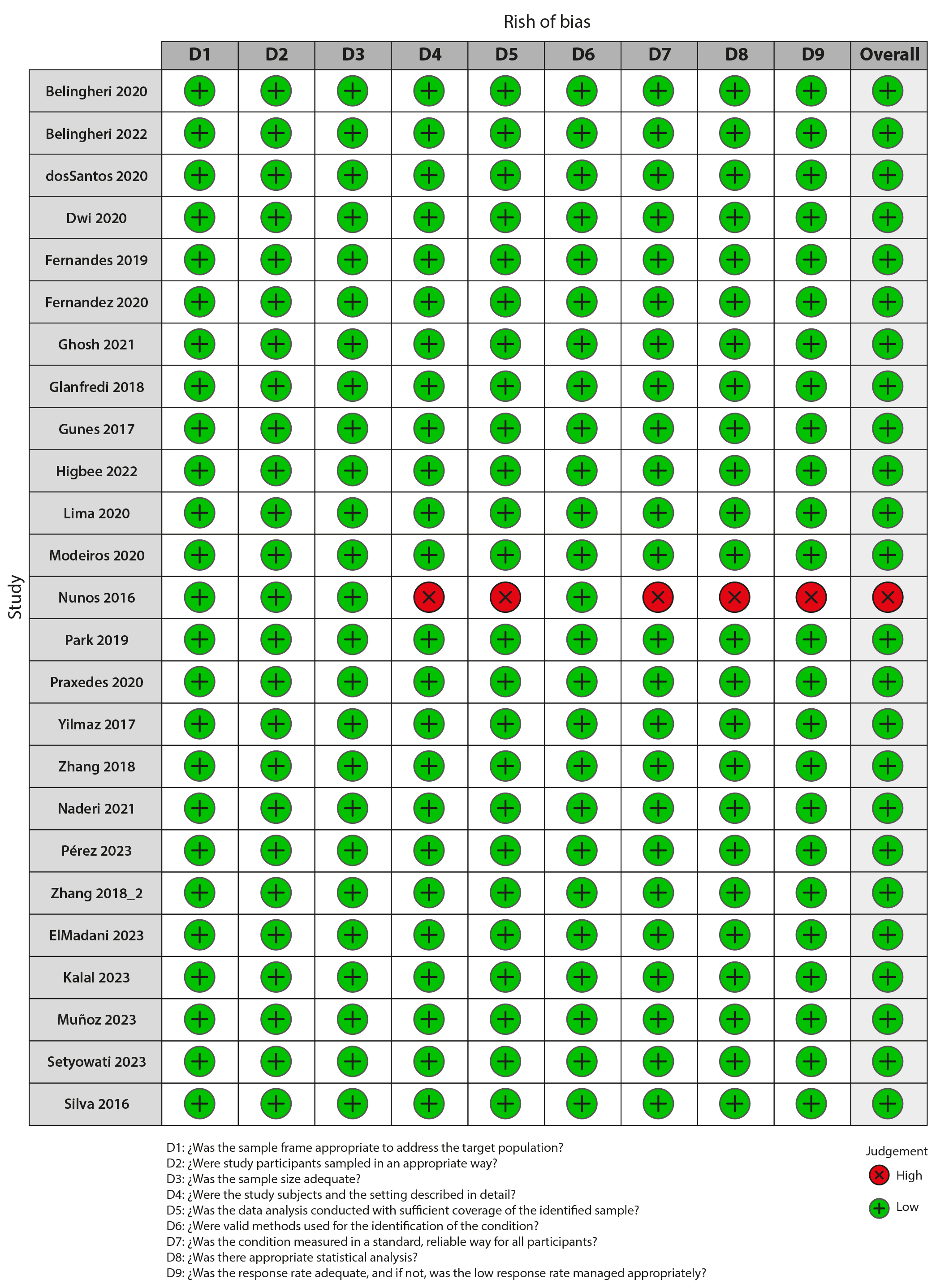 Figure 2 shows the results of the risk of bias assessment using the JBI tool for prevalence studies, which reported a score of 9 out of 9 for twelve studies, 8 out of 9 for seven studies, and 7 out of 9 for five studies; only one study obtained a score of 5 points. This indicates that all studies except one had a low risk of bias. The study by Nunes 2, classified as having a high risk of bias or low quality, had problems in the detailed description of the subjects and the study setting, in the analyses performed, and in the management of the low response rate of the participants. It was decided not to exclude this article since the sample size (n=42) did not affect the result, and its percentage weight is like that of the other studies included in the meta-analysis, both globally and regionally, in this case, Latin America.