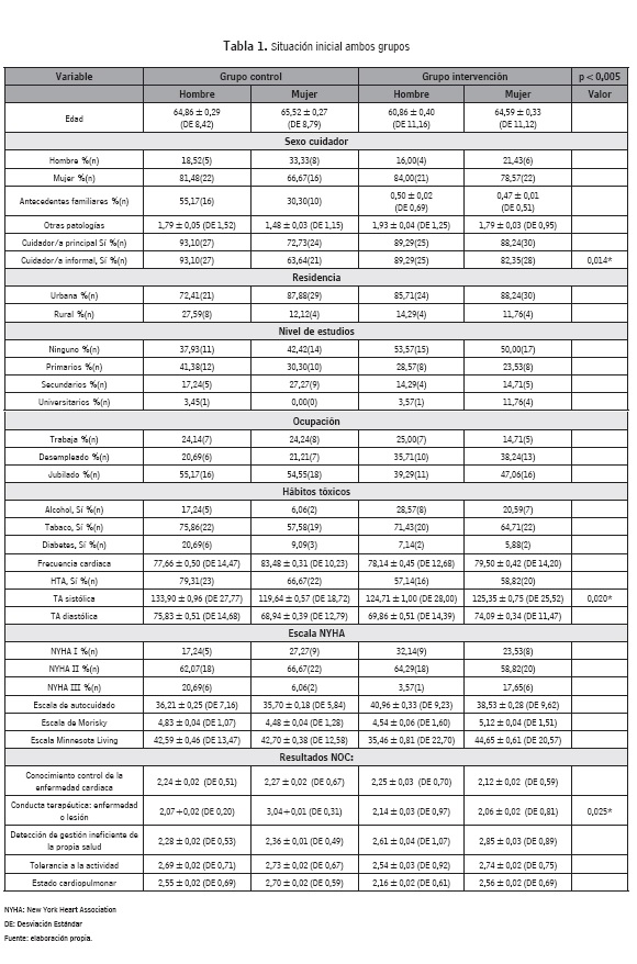Conocer la situación inicial de los pacientes estudiados respecto a su autocuidado mediante la Escala Europea de Autocuidado, adherencia terapéutica por la Escala de Morisky Modificada, calidad de vida relacionada con la salud a partir de la Escala Minnesota Living With Heart Failure Questionnarie, e indicadores de la Nursing Outcomes Classification (NOC) seleccionados.