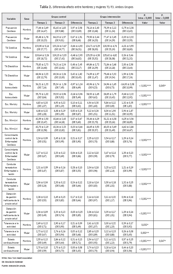 Objetivo general. La intervención ha tenido resultados diferentes en el autocuidado de hombres y mujeres, demostrando un mayor efecto en el autocuidado de los primeros.